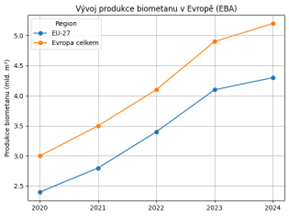 V České republice vzrostla výroba biometanu meziročně ze 103 GWh na 211 GWh. Přestože byl rozvoj v minulých letech brzděn zejména nejasnými podmínkami podpory a pomalejšími povolovacími procesy, tuzemský sektor nyní postupně zrychluje. V absolutním objemu produkce však Česko zatím za vyspělejšími evropskými trhy zaostává.