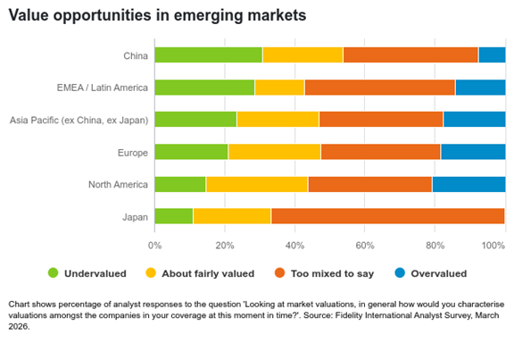 Mezi analytiky zaměřenými na Čínu považuje 31 % svůj sektor za „podhodnocený“, což je nejvíce ze všech sledovaných regionů. Pro srovnání, v Asii mimo Japonsko a Čínu je to 24 % a v regionu EMEA a Latinské Ameriky 29 %.