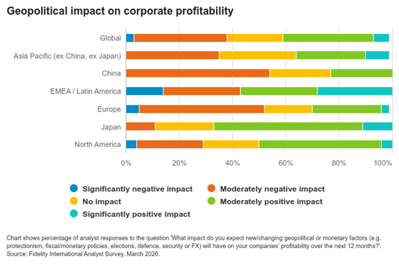 Není překvapením, že analytici sledující Evropu a některé části Asie stále častěji očekávají, že geopolitické či měnové faktory budou v příštích 12 měsících negativně dopadat na ziskovost firem. Zvlášť zranitelná se jeví Evropa, kde většina analytiků čeká středně nebo výrazně negativní dopad a nezanedbatelná část analytiků dokonce výrazně negativní scénář. Podobný obrázek nabízí i region Asie a Pacifiku mimo Čínu a Japonsko, kde negativní očekávání převažují nad pozitivními.