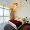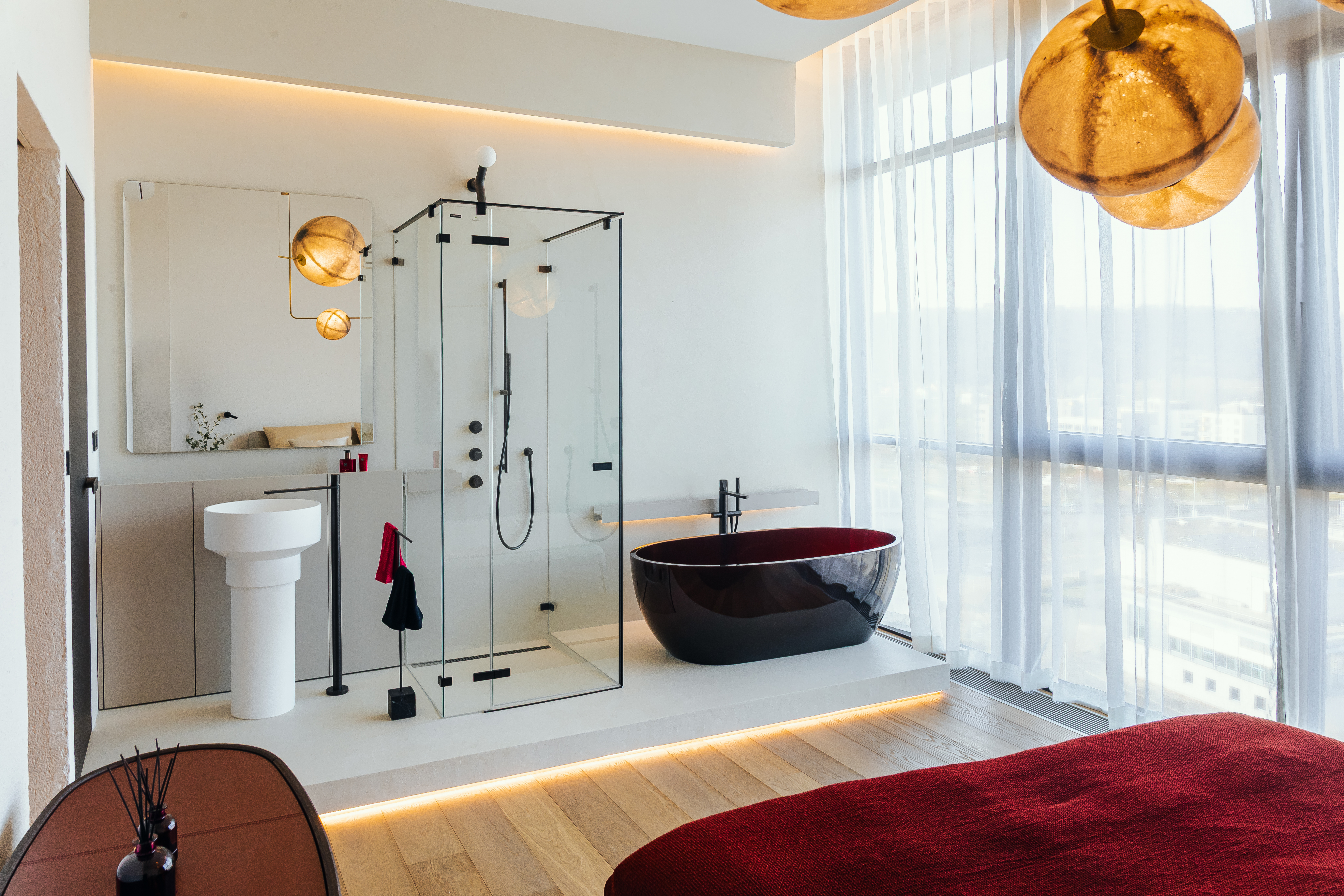 V privátní zóně se objevuje výrazný akcent v podobě vany Reflex od Antonio Lupi z barvené pryskyřice, která se stává ústředním prvkem ložnice. Tu dále doplňuje postel Kelly, noční stolky a komoda Onda, vše Poliform. Světelný objekt Superb-All od Henge, tvořený sklo-laminátovými koulemi na leštěných mosazných tyčích, pracuje na pomezí gravitace a geometrie. Koupelnu doplňuje sprchový systém Apollo od Antonio Lupi.