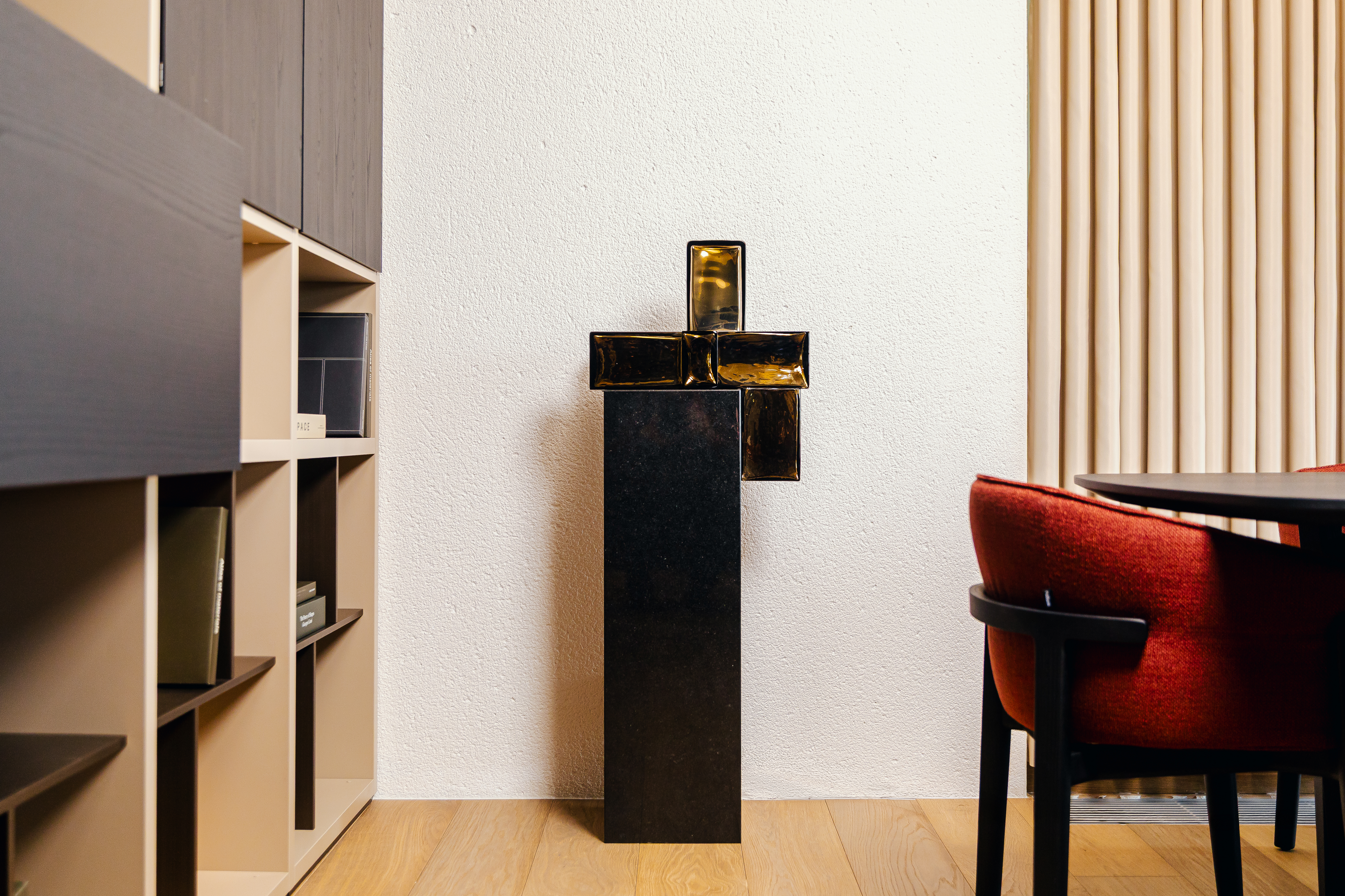 Prostor dále doplňuje dílo First Rotation – unikátní rotační skleněná skulptura z ručně foukaného českého křišťálu v kombinaci s uranovým sklem a vystříbřeným interiérem. Dílo pracuje se světlem, pohybem a optickou proměnlivostí, čímž vnáší do interiéru jemnou dynamiku a další vizuální dimenzi.
