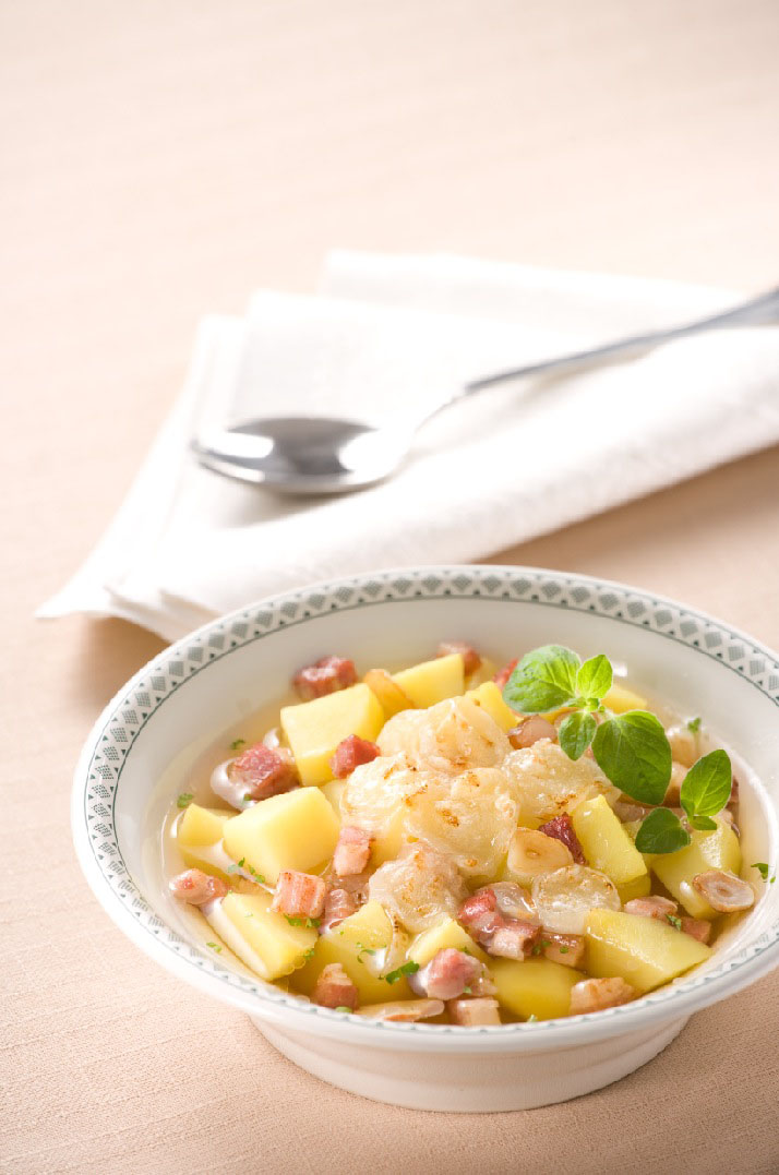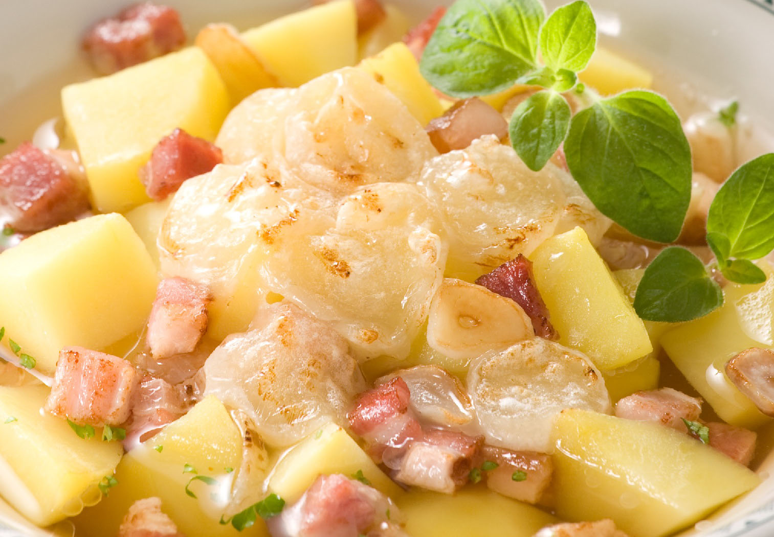 Suroviny: 3 cibule, 3 větší brambory, 1 palička česneku, 300 g Olomouckých tvarůžků, 150 g slaniny, sůl, pepř, majoránka, 1,5 l vody