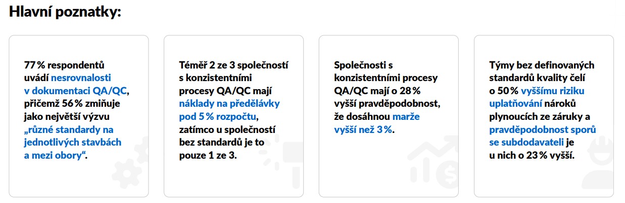 „Prosazení konzistentní kontroly kvality zůstává ve stavebnictví zásadní výzvou. Organizace sice tvrdí, že ji ‚uplatňují', ale realita je jiná – standardy se rozcházejí napříč týmy i subdodavateli. Více než polovina firem postrádá vymahatelné mechanismy vůči subdodavatelům a jednotné digitální řešení pro řízení kvality je spíše výjimkou," popisuje Adam Heres Vostarek s tím, že 78 % dotázaných odborníků je přesvědčeno, že důslednější kontrola kvality by zlepšila marže stavebních firem.