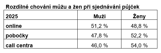 Muži častěji volí online prostředí, zatímco ženy dávají přednost osobnímu kontaktu nebo telefonnímu hovoru. V roce 2025 měly mobilní aplikace a online kanály mírně navrch u mužů: oblíbilo si je 51,2 % mužů oproti 48,8 % žen. Naopak při sjednávání půjčky po telefonu a návštěvách poboček převažují ženy. Při jednání s pracovníky call centra zákaznice představují 54 % a na pobočkách jsou zastoupeny v 52,2 %. Muži upřednostňují telefonické sjednání úvěru ve 46 % a na pobočku jich zajde 52,2 %.