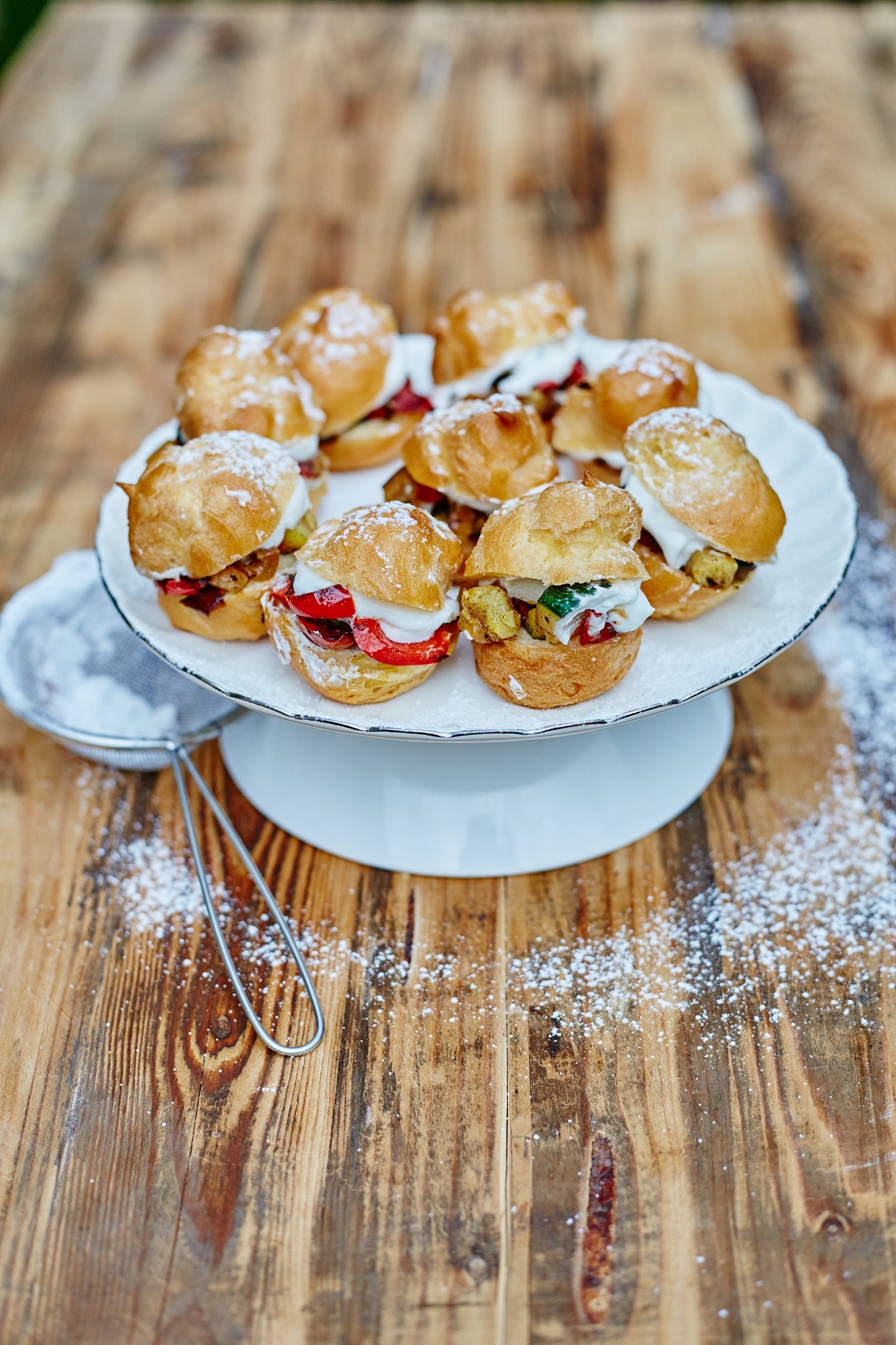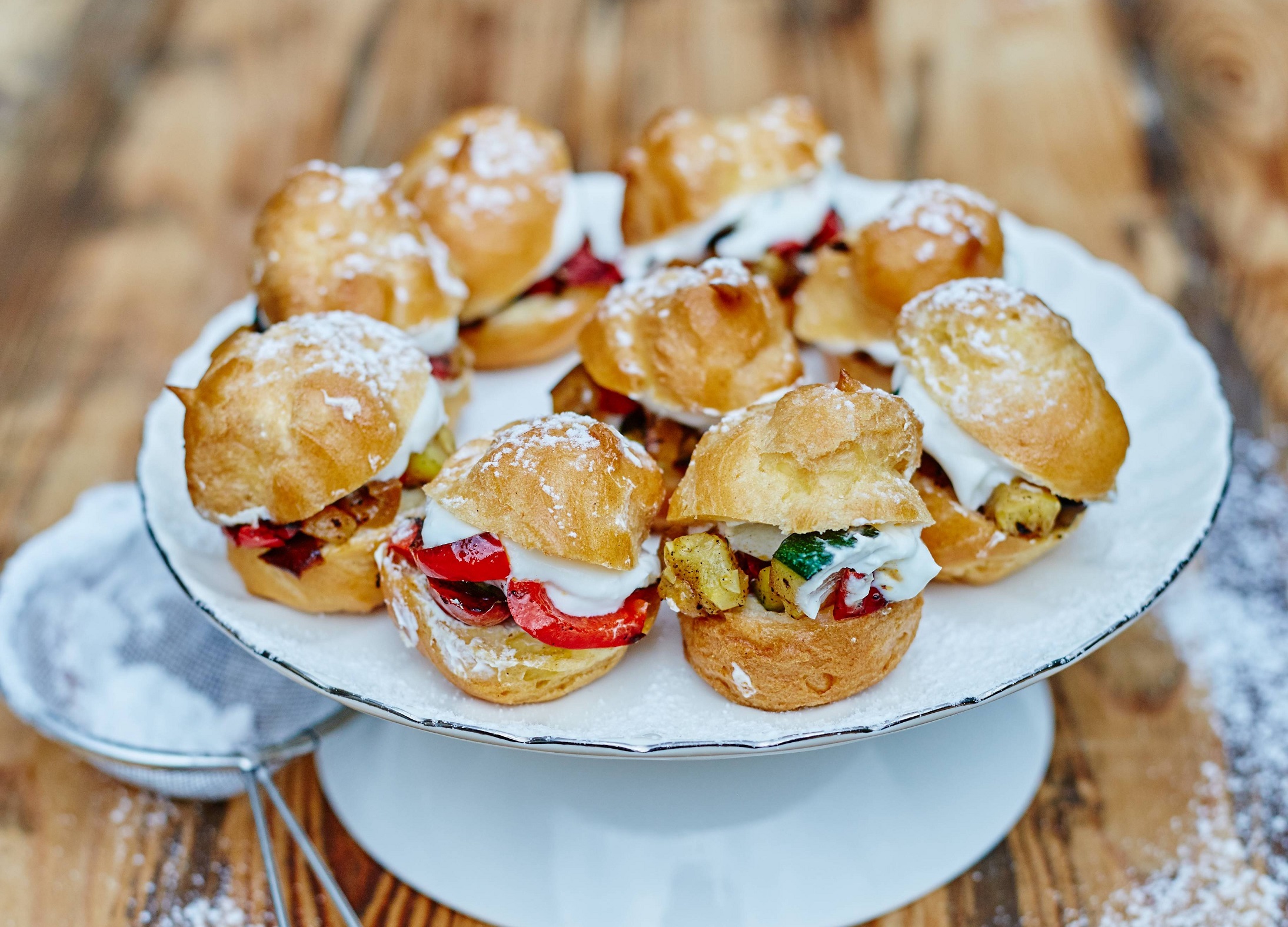 Postup: Vodu s máslem a solí přiveďte k varu, přisypejte mouku a míchejte, dokud se těsto neodlepí ode dna. Nechte zchladnout a postupně zašlehejte vejce. Těsto přesuňte do cukrářského sáčku, tvořte malé bochánky a pečte při 200 °C dozlatova. Po upečení každý kousek propíchněte a nechte vychladnout. Zeleninu nakrájejte, potřete olejem a krátce ogrilujte. Ricottu smíchejte s nastrouhanými tvarůžky a zakysanou smetanou. Vychladlé profiterolky rozkrojte, naplňte tvarůžkovým krémem a doplňte grilovanou zeleninou a polníčkem.