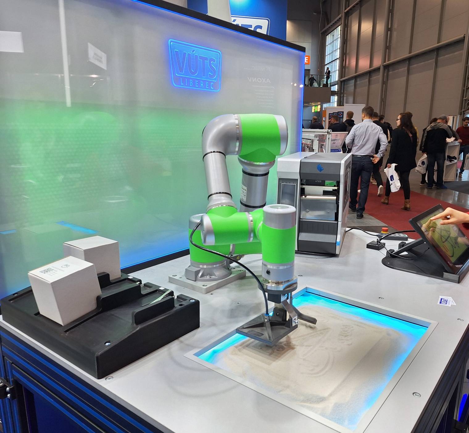 Funkční prototyp robotického pracoviště slouží v technologickém centru VÚTS jako demonstrační instalace pro výzkumné i popularizační účely. „Projekt kombinuje technologii, estetiku a zážitek pro návštěvníky. Pomocí tabletu nebo pomocí hlasových povelů mohou ovládat kobota a vytvářet vlastní návrhy, které robot přesně realizuje v nestabilním materiálu – písku. Z tohoto návrhu pak vznikne etiketa, na personalizovaný box, který si návštěvníci odnesou domů,“ dodává Ing. Jiří Václavík, Ph.D., generální ředitel VÚTS.