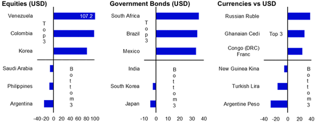 Jako obvykle se špatné zprávy prodávají dobře a většina nejčtenějších článků byla negativního charakteru. Většina z nich vyšla ve dnech následujících po oznámení celních sazeb v „den osvobození“ 2. dubna (pozn.: v roce 2024 se celní sazby v 20 nejčtenějších článcích vůbec neobjevily). První zmínka o vojenském konfliktu se objevila v článku č. 14 a druhá zmínka o Fedu až v článku č. 38, kde se hovořilo o pokusu prezidenta Trumpa odvolat guvernérku Lisu Cookovou. Domnívám se, že pozitivní výsledky trhu vděčí za mnoho odolnosti globální ekonomiky a pokračujícímu uvolňování měnové politiky ze strany většiny centrálních bank. Cla a další geopolitické faktory přinesly pouze dočasnou volatilitu (viz obrázek 2). Na základě rozhovorů s investory z celého světa byly hlavními specializovanými tématy umělá inteligence a zlato. Dluhopisy sice zaostávaly za akciemi, ale podle mého názoru dosáhly slušných výnosů, zejména pokud je měříme v amerických dolarech (viz obrázek 3). Silné výnosy zaznamenaly i americké dluhopisy, ale vyrovnaly se jim dluhopisy rozvíjejících se trhů a překonaly je dluhopisy evropské (v amerických dolarech). Obrázek 4 ukazuje výsledky našeho ročního žebříčku v rámci jednotlivých skupin aktiv. Rozvíjející se trhy často dominují na obou koncích spektra, i když japonské státní dluhopisy se již třetí rok po sobě umisťují mezi třemi nejhoršími. Venezuela vedla žebříček akcií, a to jak v místní, tak ve společné měně (Čína byla nejvýkonnějším velkým akciovým trhem). Jinak se pozitivní výnosy argentinských akcií změnily na negativní, pokud byly měřeny v amerických dolarech. Navzdory stabilizaci během čtvrtého čtvrtletí roku 2025 argentinské peso oslabilo o více než 20 % (vůči americkému dolaru) a turecká lira byla také ovlivněna vysokou mírou inflace. Ruský rubl se po silném roce blíží předválečné úrovni.