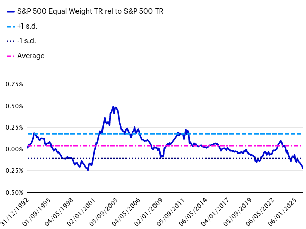 Index S&P 500 Equal Weight překonával standardní index vážený tržní kapitalizací v průměru o 1,05 % ročně až do roku 2023. Od té doby však index S&P 500 Equal Weight zaostává, protože výnosy akcií Magnificent Seven („velké sedmy“) zastínily zbytek indexu. Mnoho dnešních investorů by mohlo zvážit expozici vůči indexu S&P 500 Equal Weight kvůli třem faktorům: vysoké koncentraci, nadhodnoceným oceněním a návratu nadměrných výnosů k průměru.