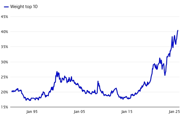 Vzhledem k tomu, že 10 největších společností v současné době tvoří 40 % váhy indexu S&P 500, riziko koncentrace nikdy nebylo vyšší (viz obr. 1). Mnoho z těchto vysoce volatilních společností působí v podobných odvětvích, což vede k vyšší párové korelaci v top 10 společnostech než v širším indexu. To dále zhoršuje problém koncentrace indexu S&P 500.