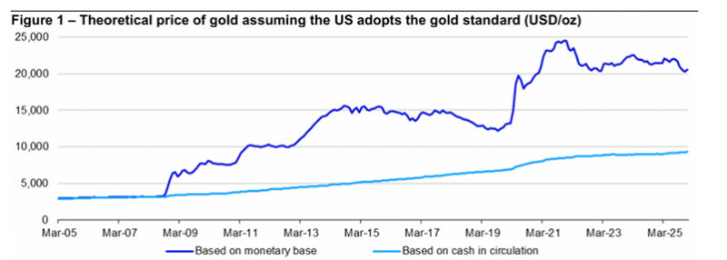 Ještě zajímavější výsledek přináší jednoduchý model „zlatého standardu“, který odhaduje cenu, při níž by oficiální zlaté rezervy USA plně kryly objem amerických bankovek a mincí v oběhu. K prosinci 2025 tento model implikoval cenu přibližně 9 300 USD za unci (viz graf 1).
