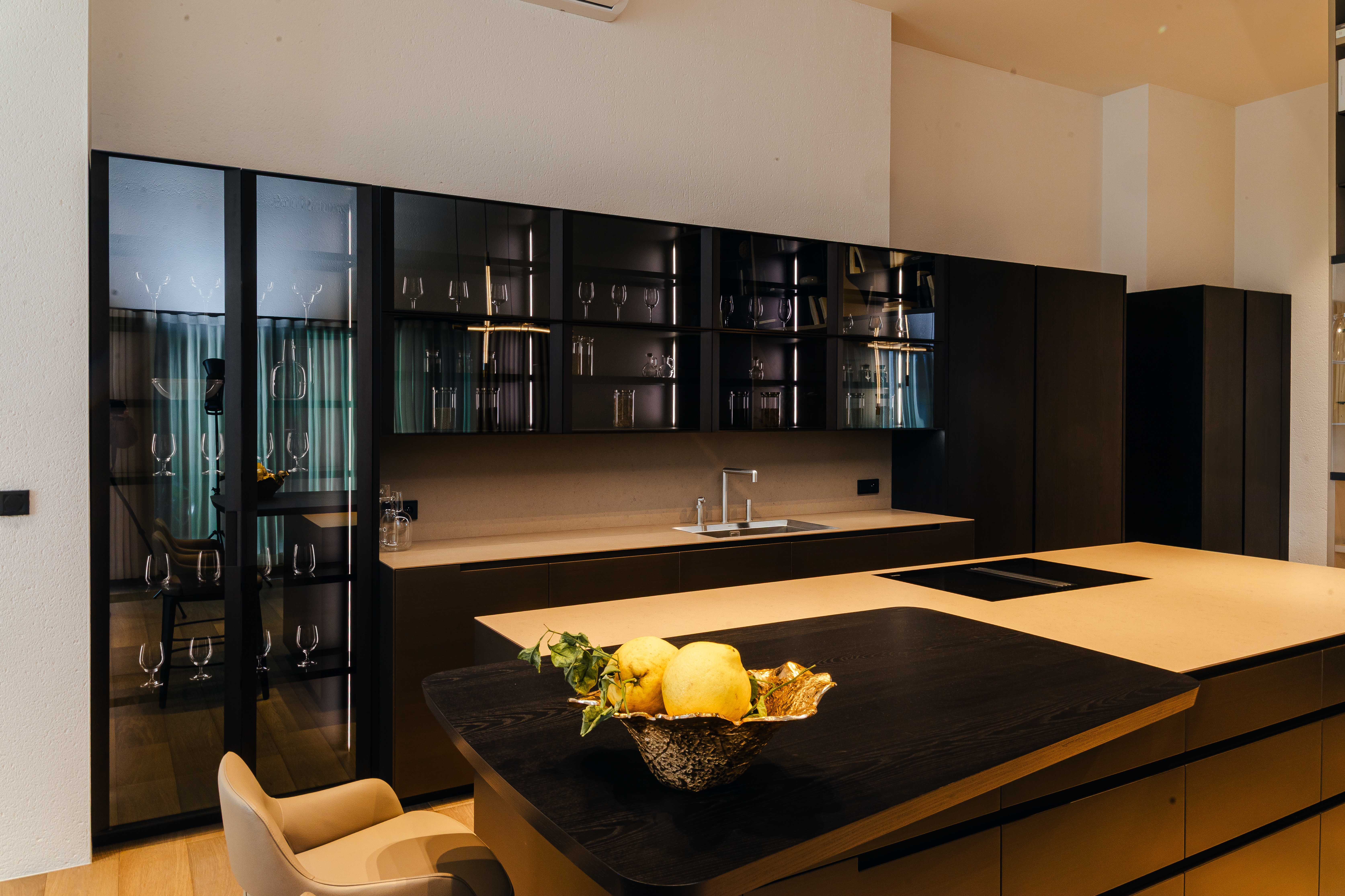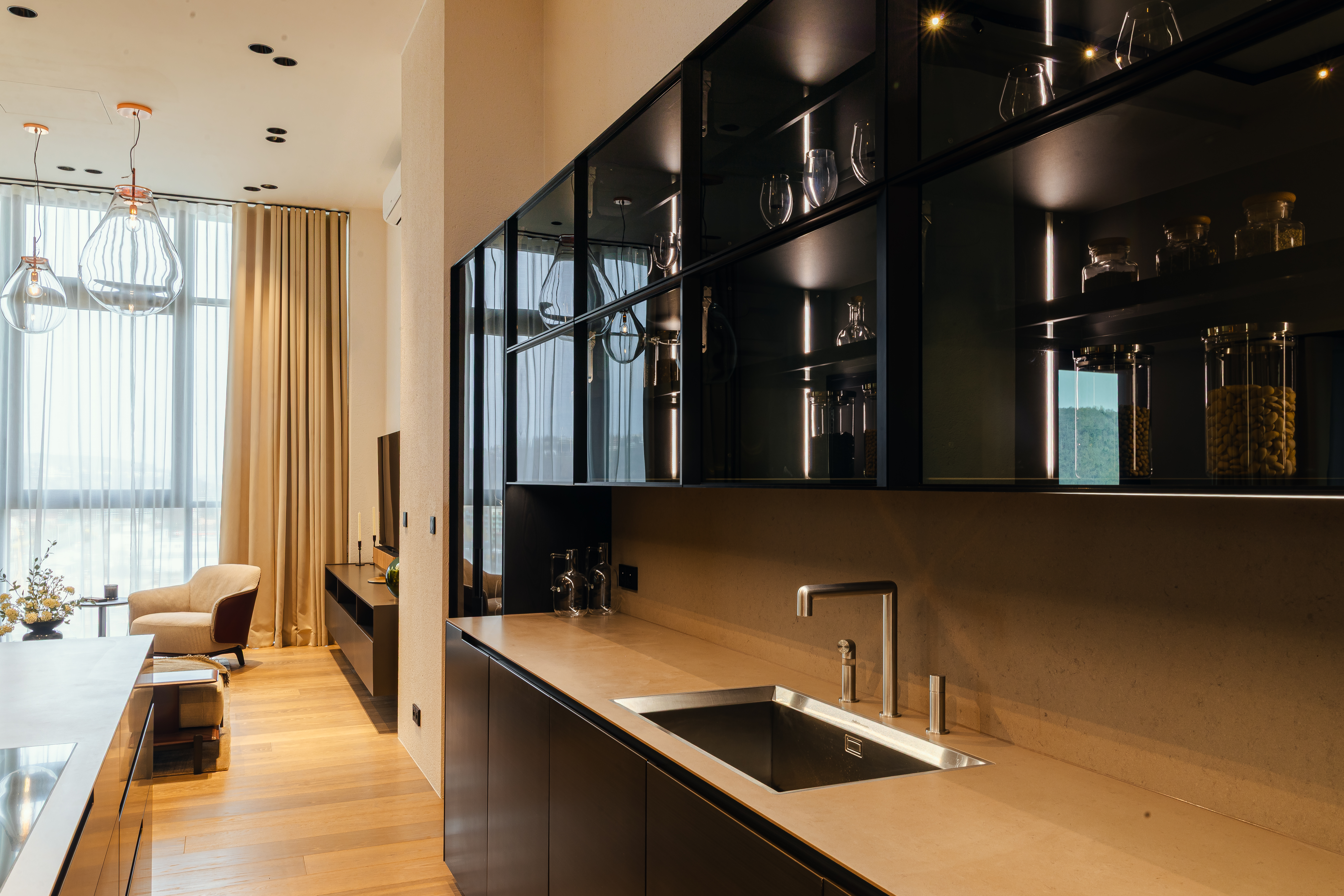 Realizace pracuje s kontrastem mezi industriální hrubostí a precizní řemeslností. Minimalistické objemy nábytku nechávají vyniknout původní architekturu prostoru, zatímco promyšlené detaily jako skryté úložné systémy a sofistikované povrchové úpravy zajišťují vysoký standard každodenního užívání.