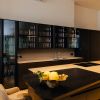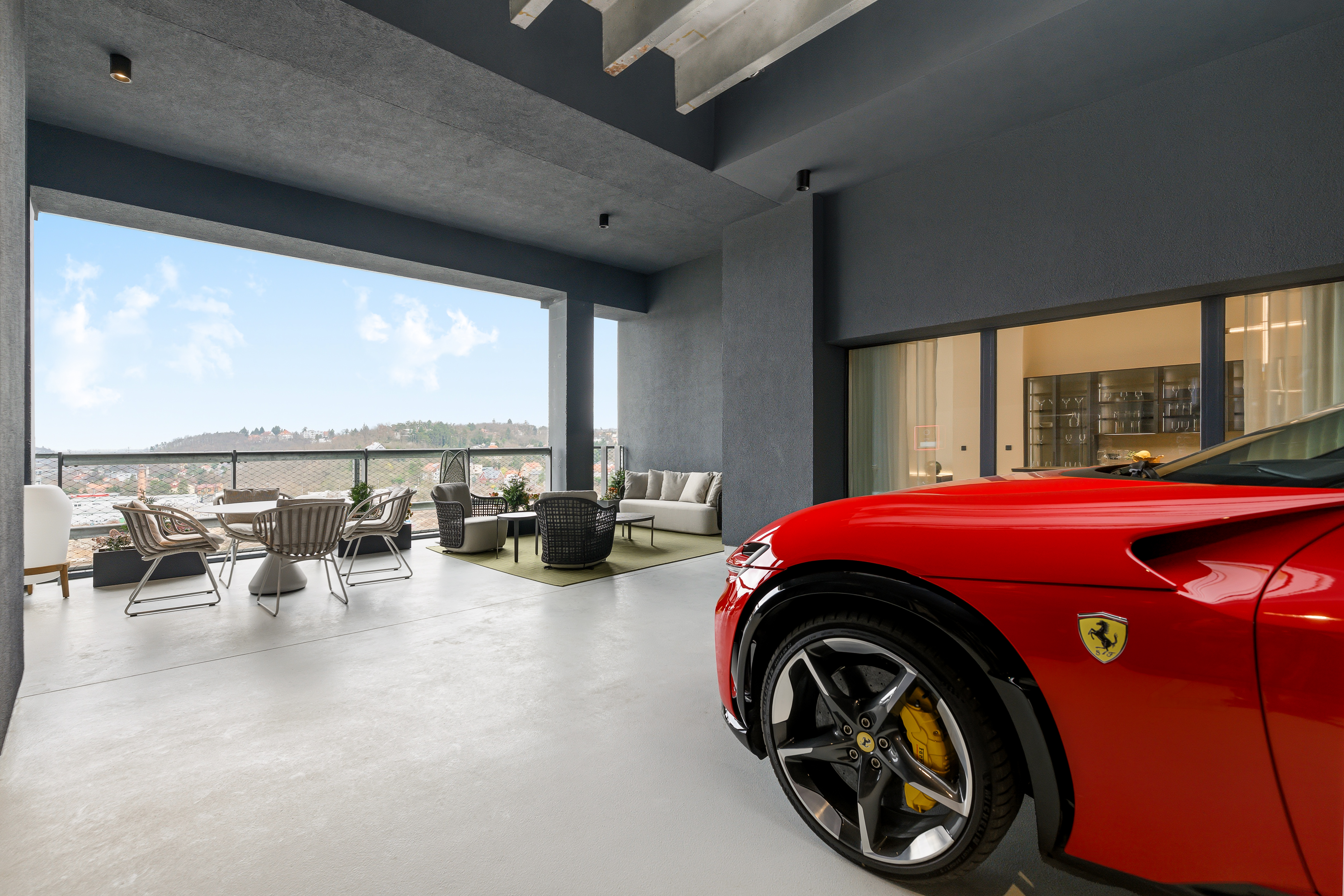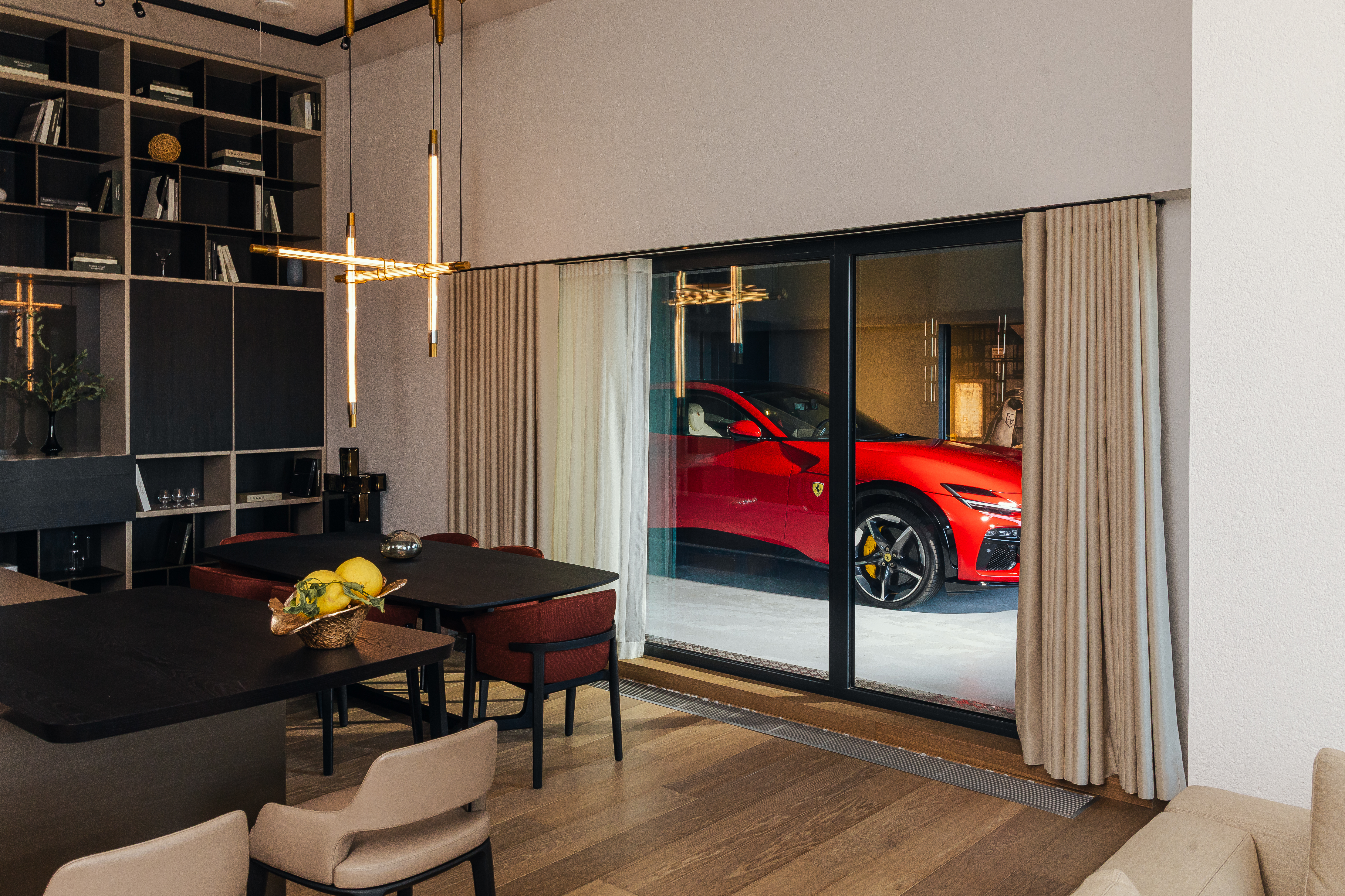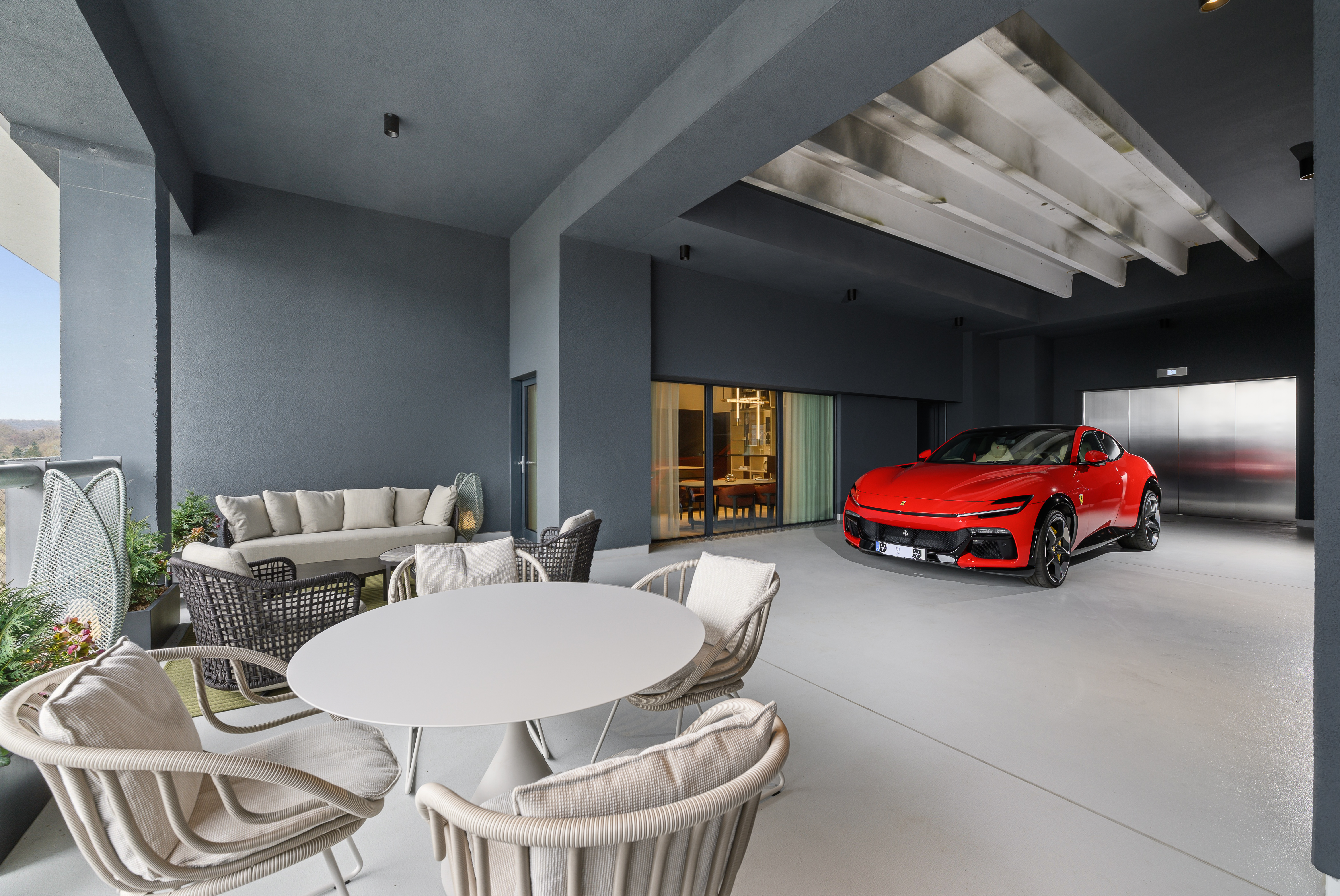 Interiér je vybaven ikonickými prvky značky Poliform a doplněn o solitérní designové objekty, které podtrhují jeho charakter. V obytné části dominuje modulární knihovna Wall System a kuchyňská sestava Phoenix, doplněná jídelním stolem Concorde a židlemi Leopold. Prostor zjemňuje sedačka Brerra a křeslo Kaori v kombinaci kůže a látky, doplněné stolky Mush a Ube. Atmosféru dotvářejí světelné objekty Spyder X od Henge a svítidla Tim od Bomma.