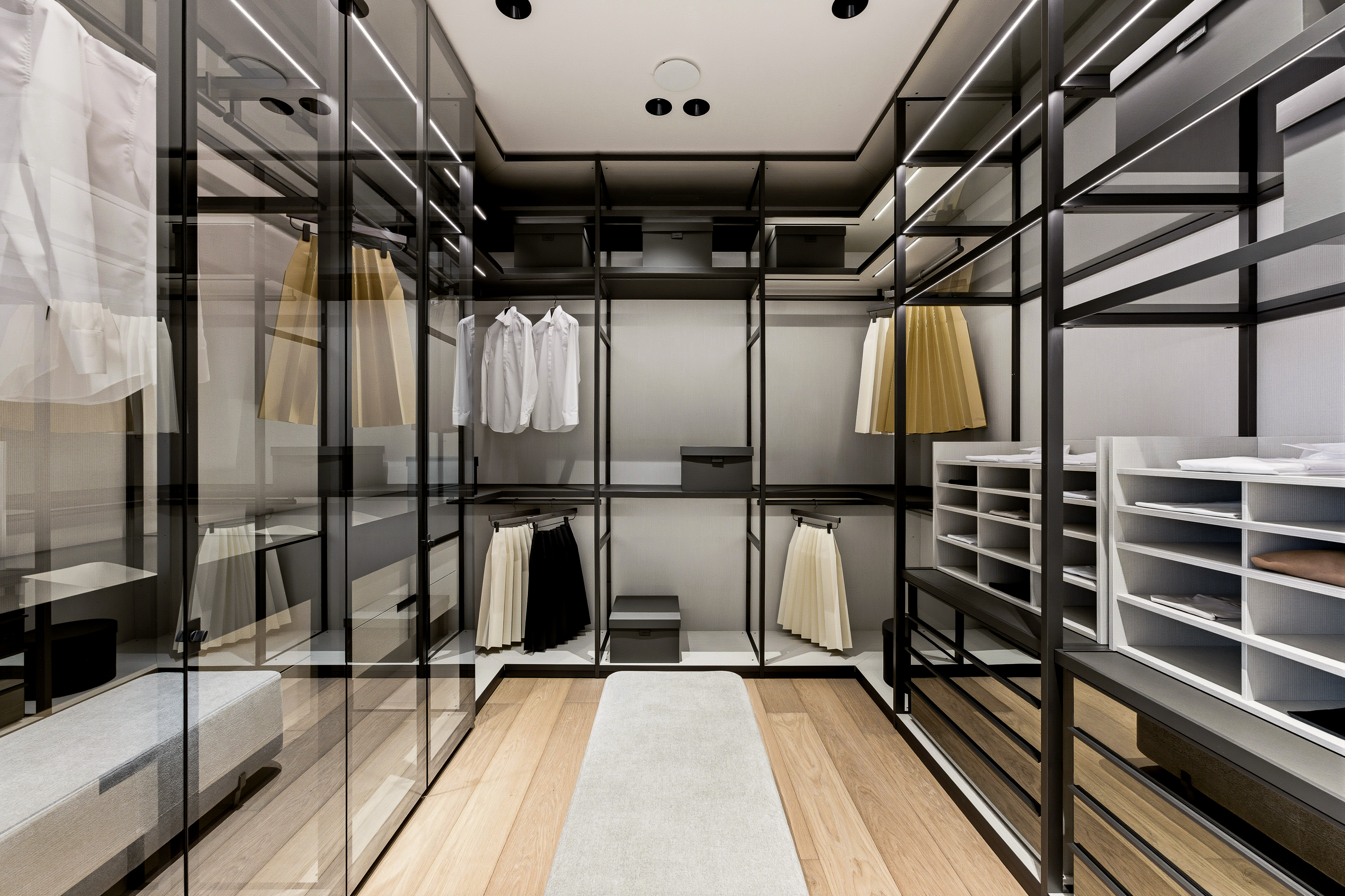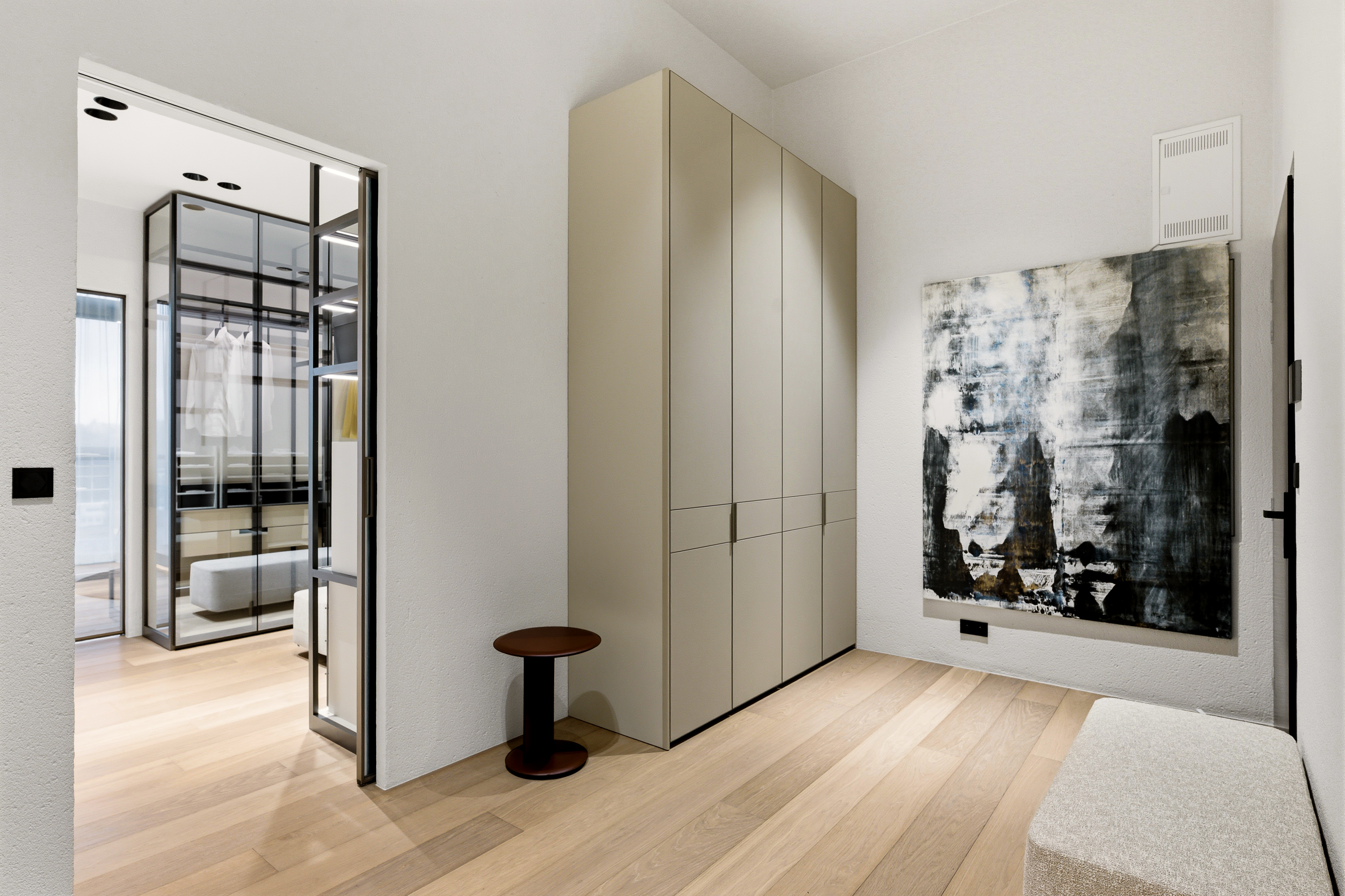Šatní prostory jsou řešeny systémem Senzafine v podobě walk-in šatny i varianty wardrobe Ego, které nabízejí maximální variabilitu a precizní organizaci typickou pro italskou značku Poliform.