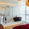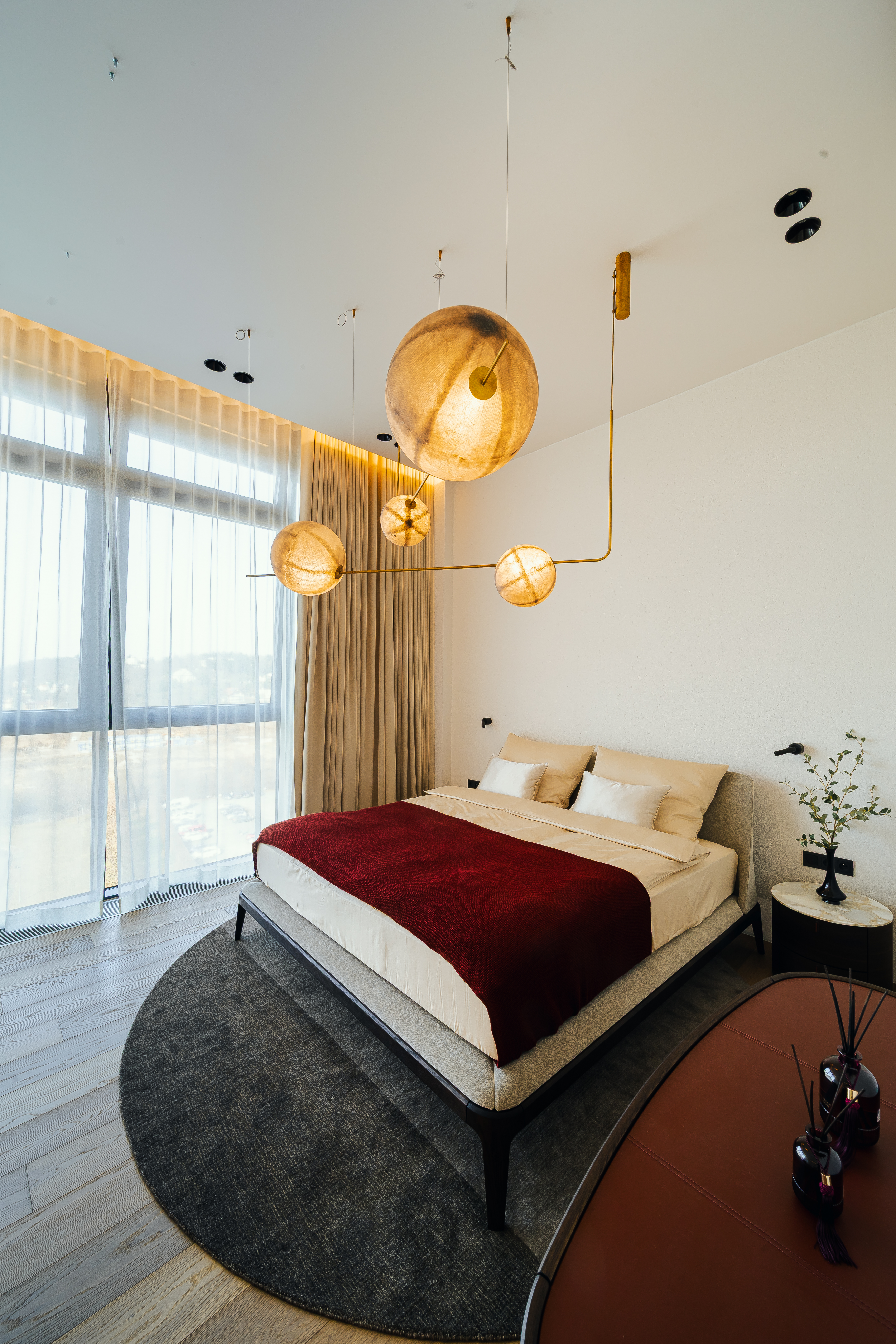 V privátní zóně se objevuje výrazný akcent v podobě vany Reflex od Antonio Lupi z barvené pryskyřice, která se stává ústředním prvkem ložnice. Tu dále doplňuje postel Kelly, noční stolky a komoda Onda, vše Poliform. Světelný objekt Superb-All od Henge, tvořený sklo-laminátovými koulemi na leštěných mosazných tyčích, pracuje na pomezí gravitace a geometrie. Koupelnu doplňuje sprchový systém Apollo od Antonio Lupi.
