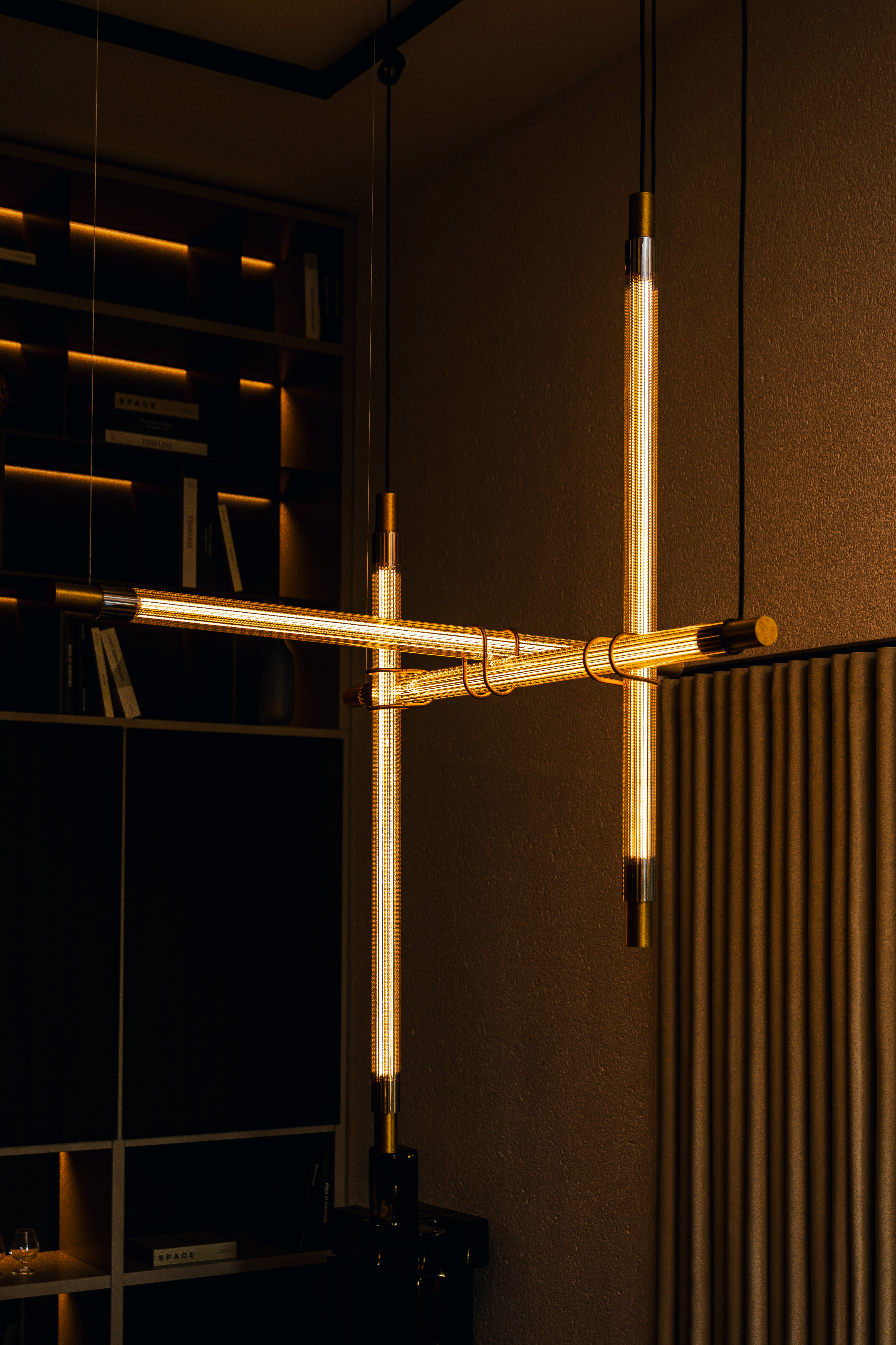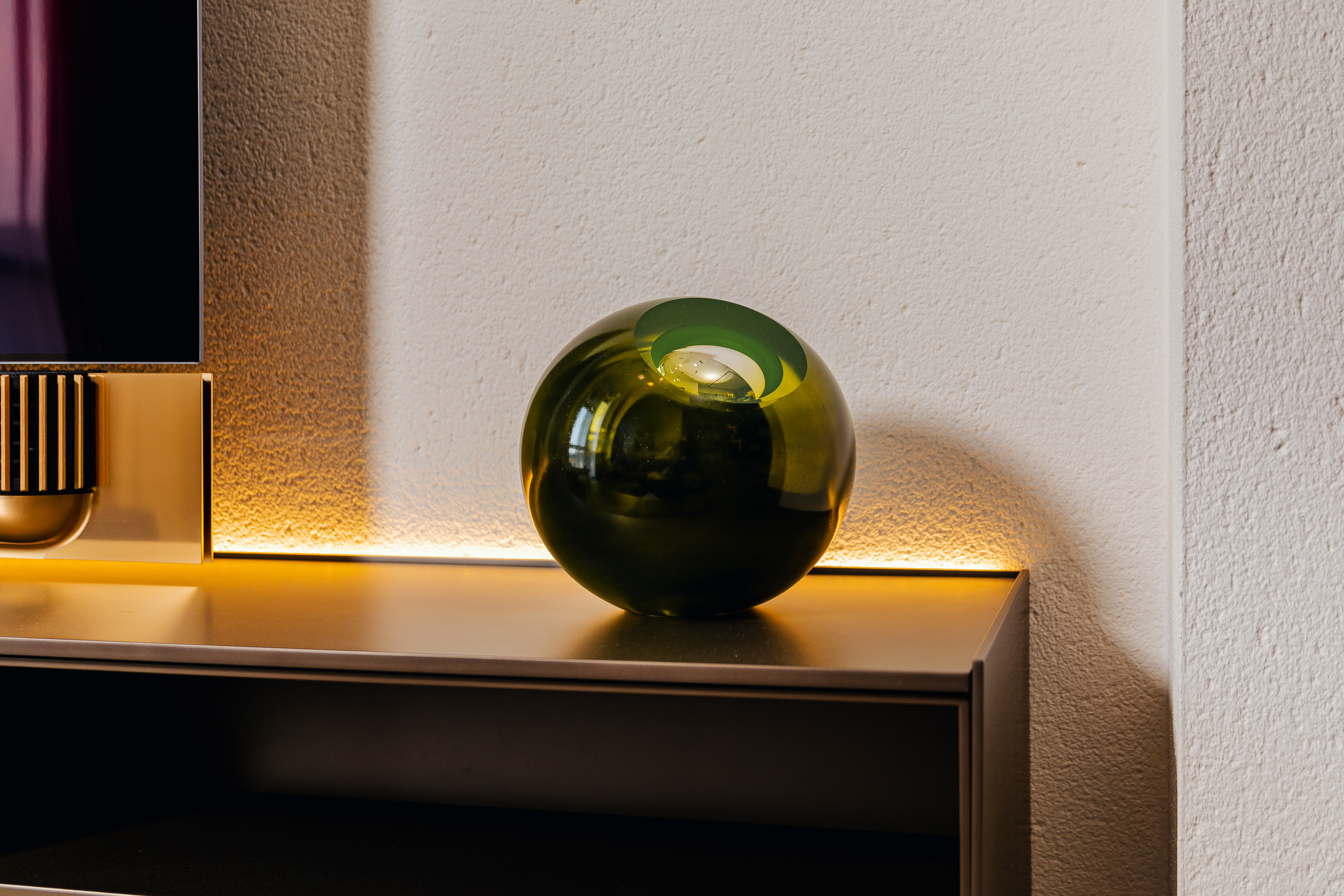 Prostor dále doplňuje dílo First Rotation – unikátní rotační skleněná skulptura z ručně foukaného českého křišťálu v kombinaci s uranovým sklem a vystříbřeným interiérem. Dílo pracuje se světlem, pohybem a optickou proměnlivostí, čímž vnáší do interiéru jemnou dynamiku a další vizuální dimenzi.