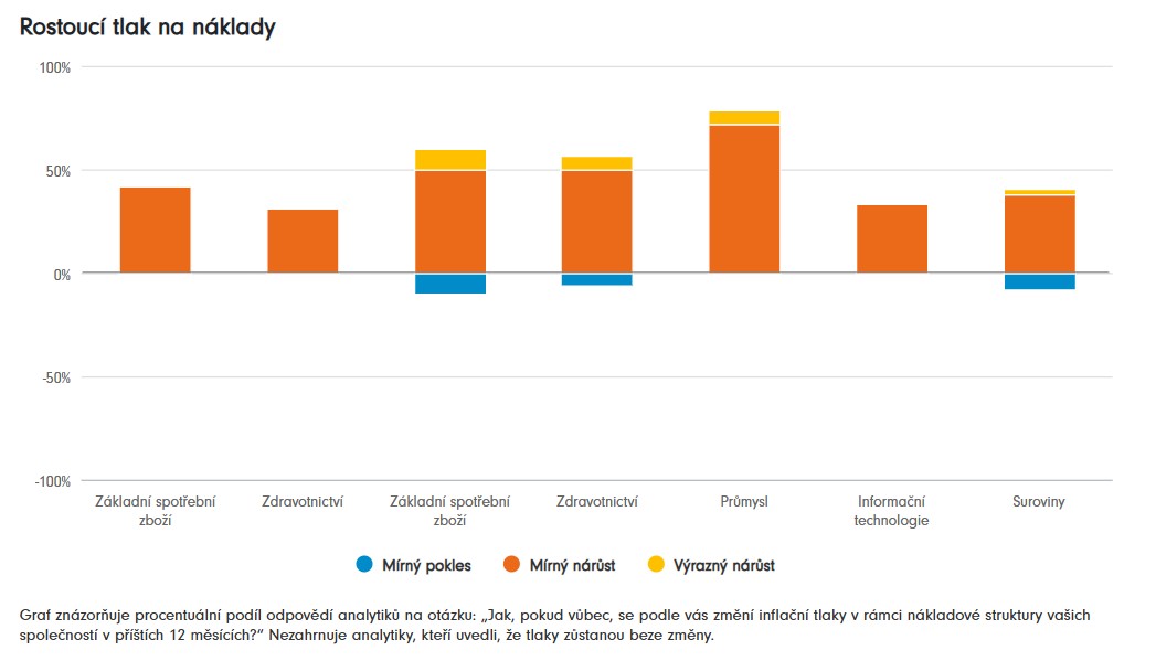 Náklady se v uplynulém roce napříč odvětvími výrazně zvýšily a mnozí očekávají, že tento tlak v nadcházejících měsících ještě poroste. Pouze 8 % analytiků zahrnutých do průzkumu očekávalo, že inflační tlaky v příštích 12 měsících poleví. Polovina uvedla, že tlaky budou pokračovat na stejné úrovni, a 40 % očekávalo nárůst.