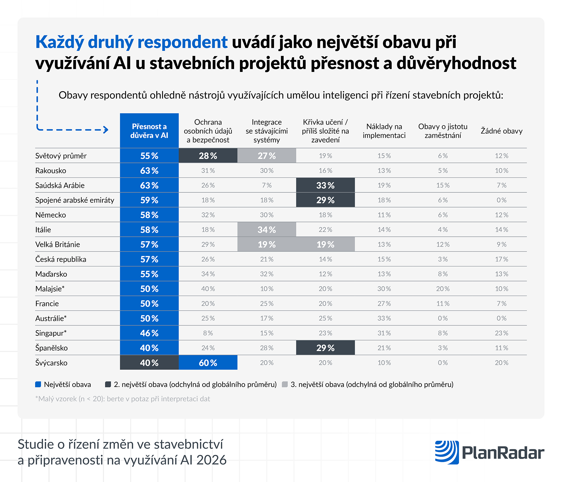 Více než polovina respondentů označila za hlavní obavu spojenou se zaváděním AI do každodenní projektové práce přesnost a důvěryhodnost jejích doporučení. Druhou nejčastěji uváděnou obavou jsou pak ochrana soukromí a bezpečnost dat. Tento vzorec se opakuje téměř ve všech sledovaných trzích. V České republice se vedle těchto témat mezi důležité otázky řadí také integrace AI do stávajících systémů, zatímco obavy z ohrožení pracovních míst zde zůstávají minimální.